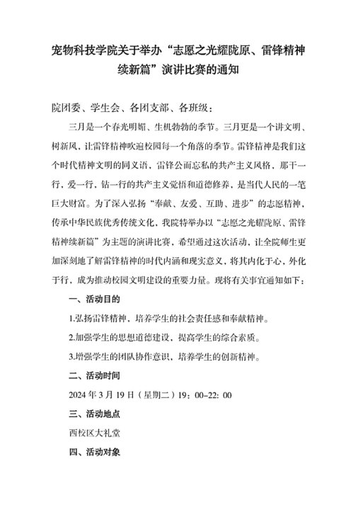 宠物科技学院关于举办“志愿之光耀陇原,雷锋精神续新篇”演讲比赛的通知 来源: 发布时间:2024-03-11 09:57:00 浏览次数: 次 【字体:小 大】 终审:宠物科技学院 分享到: 【打印正文】