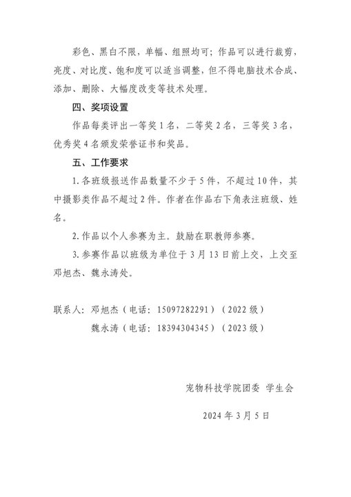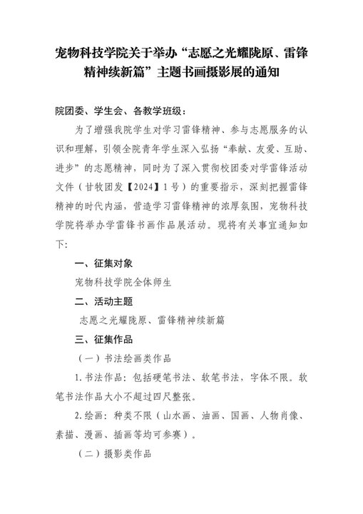 宠物科技学院关于举办“志愿之光耀陇原,雷锋精神续新篇”主题书画摄影展的通知 来源: 发布时间:2024-03-05 10:51:00 浏览次数: 次 【字体:小 大】 终审:宠物科技学院 分享到: 【打印正文】